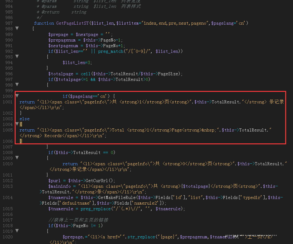 if($pagelang=='cn') {return "<li><span class=/"pageinfo/">共 <strong>1</strong>頁<strong>".$this->TotalResult."</strong> 條記錄</span></li>/r/n";}else{return "<li><span class=/"pageinfo/">Total <strong>1</strong>Page<strong> ".$this->TotalResult."</strong> Records</span></li>/r/n";}修改
