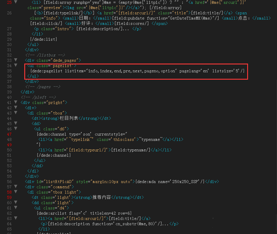 修改{dede:pagelist listsize='5'/}為{dede:pagelist pagelang='en' listsize='5'/}