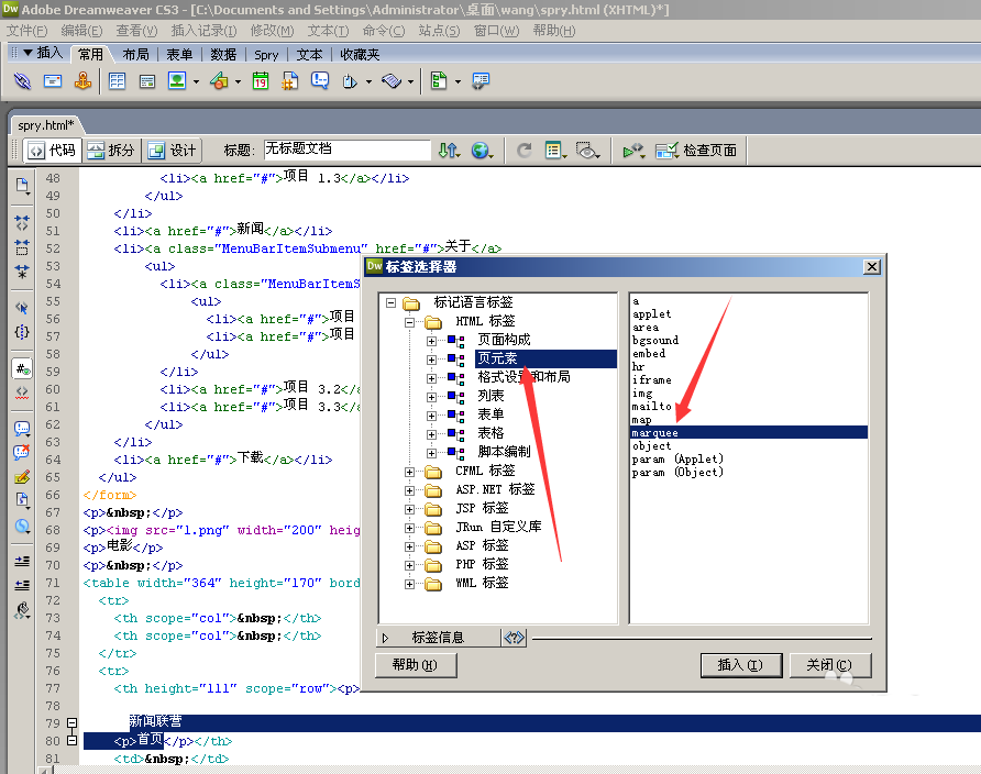 4、這里在選擇頁元素-marquee,在單擊插入。