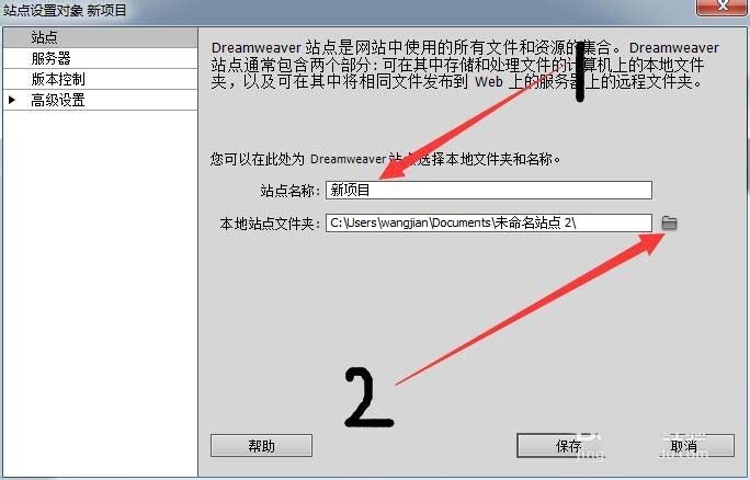 2、然后會彈出一個對話框,我們給這個站點取一個名字,然后下面點擊后面的文件夾圖標找到項目所在的文件夾。