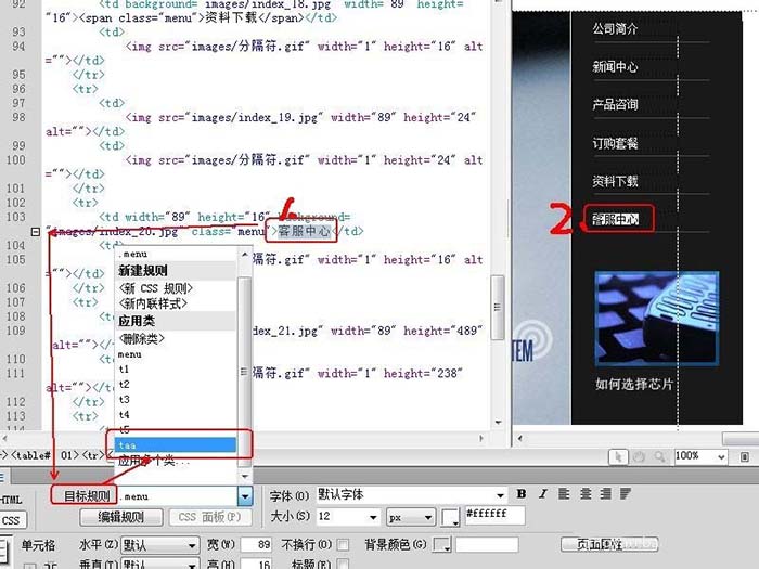 8、css樣式的使用,在全選要使用該樣式的文字(在1或2處選擇都可以),然后選擇目標規則為taa