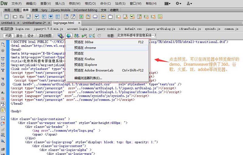 demo寫的差不多了,可以點擊菜單中的預覽按鈕,先預覽一下。Dreamweaver提供了360,IE,谷歌,火狐等瀏覽器可供預覽。