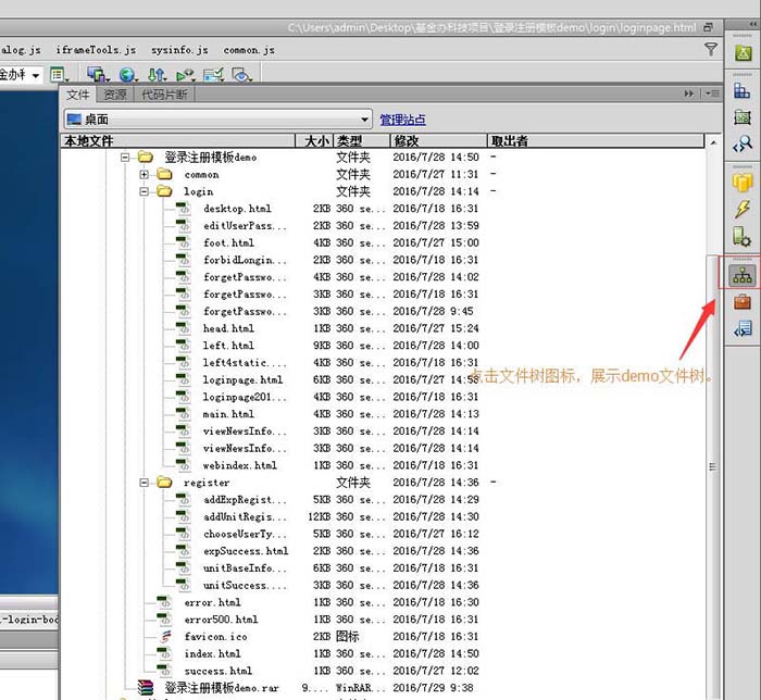 點擊右側面板中的文件面板,彈出文件樹窗口。在這里可以管理網站demo使用的文件。