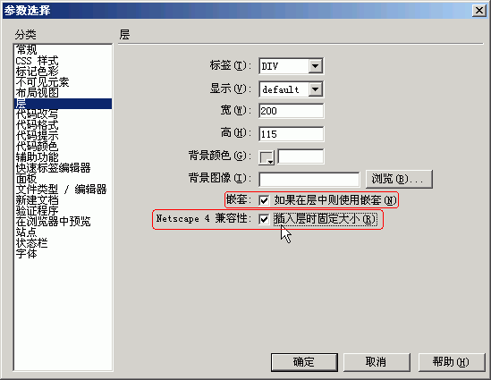 在使用嵌套層之前,先要對層做一些參數設置。選擇“編輯”/“參數選擇”菜單,在“參數選擇”對話框中,選中“netscape 4 兼容性:插入層時固定大小”,這樣制作的嵌套層就可以兼容netscape 4瀏覽器。并且選中“嵌套:假如在層中則使用嵌套”。|||