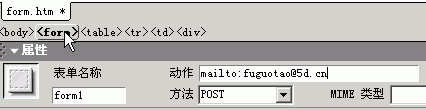 9.選中文檔左下角“標(biāo)簽選擇器”上的form標(biāo)簽,在屬性面板上,動(dòng)作中輸入mailto:網(wǎng)站治理員的電子信箱地址,在方法中選擇post。