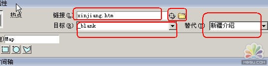 ( 3 )當繪制完矩形熱點區(qū)域后,圖像屬性面板將變成熱點屬性面板,如圖 3 所示。在鏈接欄處選擇熱點區(qū)域所要鏈接的目標網頁,在【替代】框中填入相關的提示說明,并使鏈接的網頁在新窗口中打開。