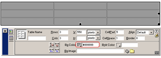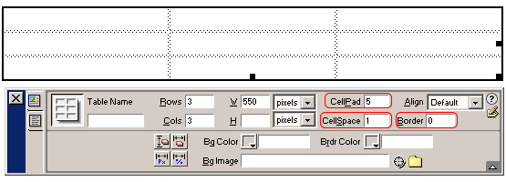 2、在屬性面板中定義表格的border為0,cellpad為5(這項可使單元格中的內容與單元格邊緣之間保持5個像素);cellspace為1(此項使得單元格之間保持1個項素的間距)。如圖三;