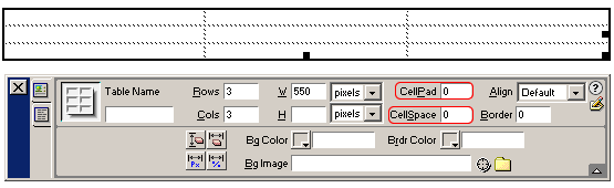 1、使用object面板插入一個表格,定義表格寬、高及行數和列數。注重此時dreamweaver中插入表格的默認cellpad和cellspace、border都為0。如圖二;