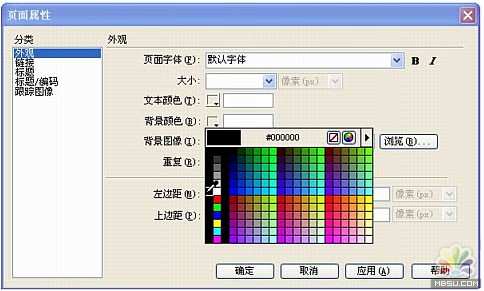 在"頁面屬性"對話框的"外觀"類別中,單擊"背景顏色"顏色框,然后從顏色選擇器中選擇黑色 (#000000)。