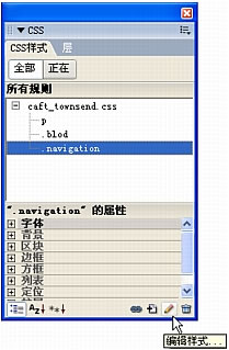 在"css 樣式"面板中,確保選中了"全部"模式,選擇新的 .navigation 規(guī)則,然后單擊面板右下角的"編輯樣式"。