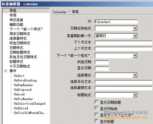 (4)按“插入”按鈕,彈出【標(biāo)簽編輯器—calendar】對話框,如圖10-3所示。在這個(gè)對話中,可以對calendar日歷控件的樣式進(jìn)行設(shè)置,由于有中文,在這里就不多講了。
