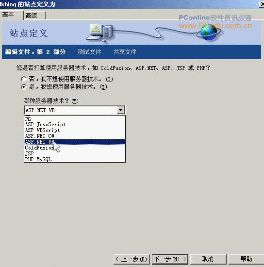 (3)單擊“下一步”,選擇“是,我想使用服務器技術。(y)”,在“哪種服務器技術?(w)”下拉菜單中,選擇“asp.net vb”,結果如圖2-7所示。|||