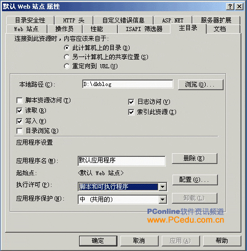 (2)右鍵單擊“默認web站點”,選擇屬性,打開【默認web站點屬性】對話框,在對話框中,單擊【主目錄】選項卡,把本地路徑指向“d:/dkblog”,在“執行許可(p):”下拉菜單中選擇“腳本和可執行程序”,結果如圖2-3所示。