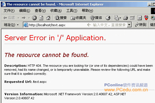 打開ie瀏覽器,在地址欄上打上“localhost/text.aspx”,假定text.aspx這個文檔現在不存在,那么ie瀏覽器上一定會返回錯誤信息,假如出現如圖2-4所示的錯誤信息,說明我asp.net的運行環境基本構建完畢。