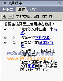 (2)在【文件】菜單中,選擇【新建】,在【新建對話框】中,選擇類別為“動態頁”,選擇動態頁為“asp.net vb”,按“創建”按鈕創建第一個動態網頁。切換到【應用程序】面板,選擇【綁定】選項卡,如圖2-11所示。