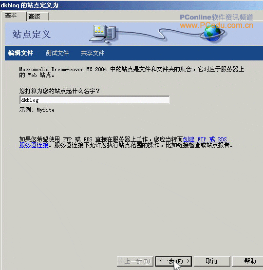 (2)在其下接菜單中,選擇“站點(s)”,在彈出對話框中,輸入站點名字“dkblog”,結果如圖2-6所示。