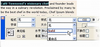 出現(xiàn)"css 規(guī)則定義"對話框,表示您正在 cafe_townsend.css 文件中創(chuàng)建一個稱為 .bold 的類樣式。