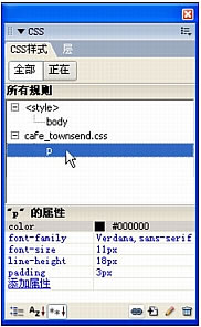 在"所有"模式下,css 面板向您顯示應(yīng)用到當(dāng)前文檔的所有 css 規(guī)則,不管這些規(guī)則是在外部樣式表中,還是在自身文檔中。您應(yīng)在"所有規(guī)則"窗格中看到兩個主要類別:一個<style> 標(biāo)簽類別和一個 cafe_townsend.css 類別。