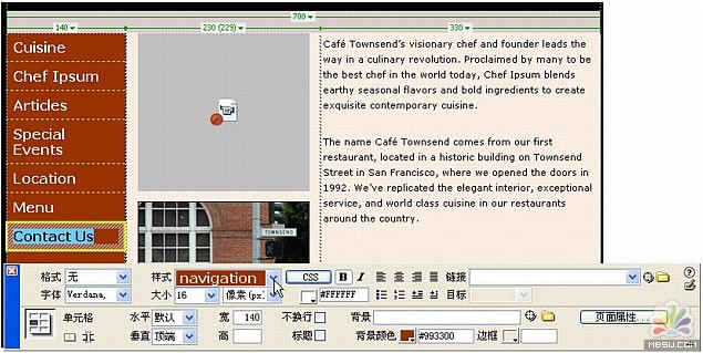 在"文檔"窗口中,cuisine 文本的外觀完全發(fā)生了變化。根據(jù)您在上一節(jié)中為 .navigation 規(guī)則所定義的屬性,該文本的格式現(xiàn)在已被設(shè)置為導(dǎo)航條按鈕。