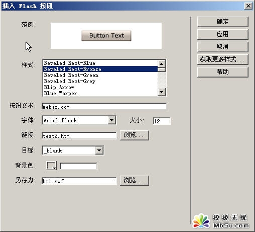 ( 2 )插入 flash 按鈕并設(shè)置參數(shù),如圖1、2 所示。 VeVb.com