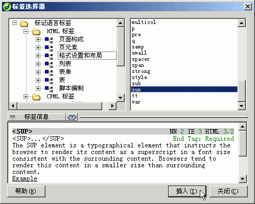 3.在“標簽選擇器”中選擇sup標簽,單擊“插入”按鈕。