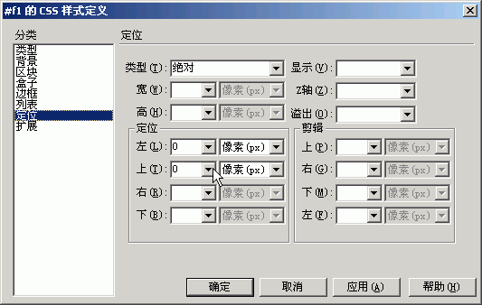 5.在“定義”類別中,選擇定位類型為“絕對”,在“定位”框中,“左”和“上”輸入數值。按“確定”按鈕完成CSS設置。