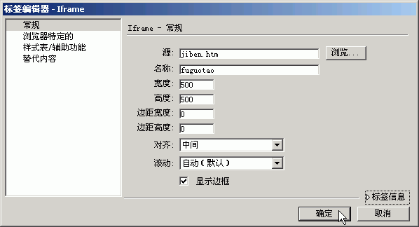 源:點擊“瀏覽”按鈕,選擇要出現在iframe中的網頁文件。