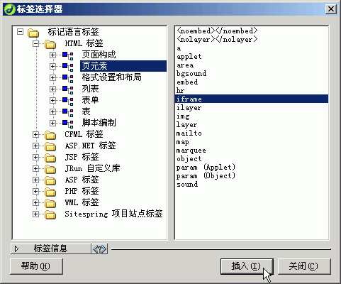 2.在“標簽選擇器”對話框中,選擇iframe標簽,點擊“插入”按鈕。