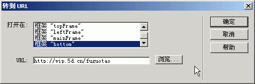 4.假如想點擊鏈接,改變更多的框架內容, 重復使用“轉到 URL”行為,實例中選擇“bottom”框架。