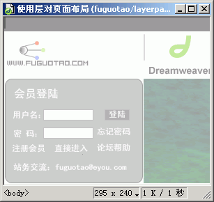 假如要使用單一的大圖片作為頁面背景圖像,并且背景圖像內容很多,就不需要再設置“跟蹤圖像”了。使用“層”布局也會更簡單,只需要描繪出放置文字內容、表單、鏈接、圖像的層就可以了。