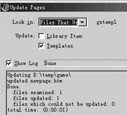 打開“Templates”子選項,雙擊關聯網頁的模板,這時候模板進入了可編輯狀態,黃色區域消失,改變的模板的內容后,保存時就會出現一個提示對話框:“下列網頁使用了當前模板,是否進行更新?”(如圖2)單擊“Update”,此時,網站中所有基于模板創建的關聯網頁都將得到更新(如圖3)。