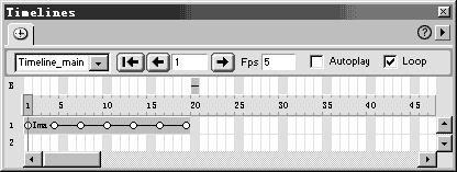 按Ctrl F9鍵打開時(shí)間鏈浮動(dòng)工具面板。選取其中幻燈片所在層(Layer_main)中的初始圖片(確保選取的是圖像,而不是層),用鼠標(biāo)拖至?xí)r間鏈浮動(dòng)工具面板,在時(shí)間鏈起始處釋放鼠標(biāo)。設(shè)定幀速率為Fps為5,并勾選Loop框。選擇時(shí)間鏈中的其中一幀,右擊鼠標(biāo),選擇"Add Keyframe"(添加要害幀),選擇另一幅幻燈片圖片,以更換層(Layer_main)中的初始圖片。重復(fù)這個(gè)操作,將剩下的5幅圖片全部加到該時(shí)間鏈的不同要害幀上。最后適當(dāng)調(diào)節(jié)各要害幀之間的距離。并將該時(shí)間鏈命名為TimeLine_main。建立好的時(shí)間鏈如圖所示。