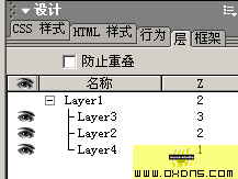 6.怎么樣,看到了吧:)我們再給圖層添加上一個簡單的關閉動作,就是點擊關閉按鈕后圖層隱藏。選擇上關閉按鈕,轉到行為面板,點擊菜單中選擇 [顯示隱藏層] ,在跳出的窗體中選擇上layer4,然后點擊下面的隱藏按鈕,將其設置為隱藏,如圖: