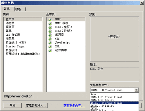 2,新建文檔對話框,注重具有了XSLT的選項(同時新建的文檔類型默認為XHTML 1.0 Transitional)