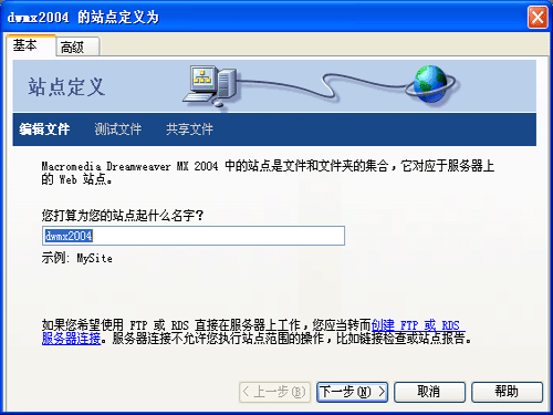 在 Dreamweaver MX 2004中,選擇“站點”>“治理站點”。治理站點對話框中“dwmx2004”是在本教程第5頁設置的,假如想回憶一下,請查看“設置站點”。