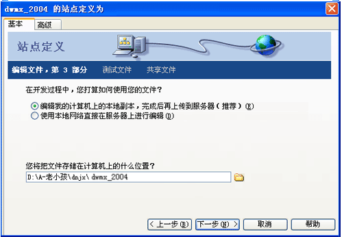 選擇標(biāo)有“編輯我的計(jì)算機(jī)上的本地副本,完成后再上傳到服務(wù)器(推薦)”的選項(xiàng)。 在站點(diǎn)開發(fā)過程中有多種處理文件的方式,初學(xué)網(wǎng)頁制作的朋友請選擇此選項(xiàng)。