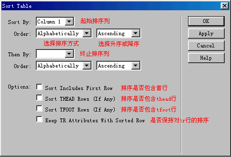 (2)出現sort table窗口,sort by項選擇column 1,order項選擇按字母排序Alphabetically和升序排列Ascending,其它各項各位可參照圖5根據需要進行選擇。