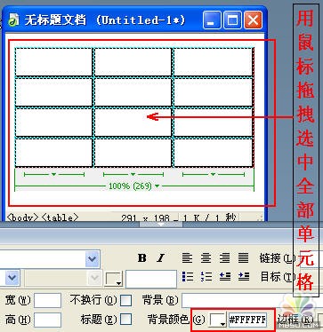 Step 3 選中此表格的所有單元格,在“屬性”面板中設置所有單元格的屬性如下:背景顏色(Bg)為白色或紅色以外的其他顏色。
