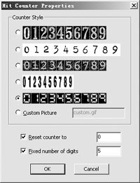 計(jì)數(shù)器可以統(tǒng)計(jì)并顯示網(wǎng)頁的訪問次數(shù)。向網(wǎng)頁中添加計(jì)數(shù)器的方法是,在網(wǎng)頁視圖中打開站點(diǎn)首頁index.htm,將插入點(diǎn)放在要放置計(jì)數(shù)器的位置,然后執(zhí)行“插入/web組件”命令,在左邊的窗格中選擇“計(jì)數(shù)器”,并在右邊窗格中選擇計(jì)數(shù)器樣式,最后單擊“完成”按鈕進(jìn)入計(jì)數(shù)器參數(shù)設(shè)置對(duì)話框(如圖4),選擇一個(gè)計(jì)數(shù)器的圖片樣式,如果要將計(jì)數(shù)器設(shè)置成某個(gè)特定數(shù)字,可以選中“reset count to”選項(xiàng)并輸入一個(gè)數(shù)字即可。若要在計(jì)數(shù)器中顯示固定位數(shù)的數(shù)字,可以選中“fix number of digits”選項(xiàng),并設(shè)定相應(yīng)的數(shù)值。最后單擊“確定”按鈕后,網(wǎng)頁上就會(huì)顯示計(jì)數(shù)器的占位符了。