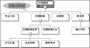 單擊“視圖/導(dǎo)航”命令或直接點(diǎn)擊視圖工具欄的“導(dǎo)航”按鈕,切換到“導(dǎo)航”模式下。從左邊列出的文件夾列表中選定主頁(yè)往右邊導(dǎo)航欄中拖放,再把其他選定的網(wǎng)頁(yè)拖到主頁(yè)下邊,形成導(dǎo)航結(jié)構(gòu)圖(見圖2)。若想把某個(gè)網(wǎng)頁(yè)從導(dǎo)航結(jié)構(gòu)中退出或刪除,則在該頁(yè)的方框圖上右擊鼠標(biāo),去掉“已加入導(dǎo)航欄”的小勾或選擇“刪除”功能。