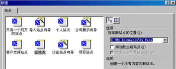 在接下來彈出的窗口中你可以看到圖2。frontpage2000自帶有一些網站的模板(意思就是按照它的意思去做),我們一般不使用這些模板,我們在左邊的模板選擇窗里選“空站點”,然后在右邊的“選項,指定新站點的位置”中敲入你想保存這個網站的文件夾地址。一般第一次使用frontpage2000的時候它自動就生成了一個新站點,保存的“我的文檔”的“my webs”文件夾中。你也可以重新建立一個文件夾作為網站的存放點。我們在以下稱保存網站的文件夾為“網站文件夾”或者是“主文件夾”。