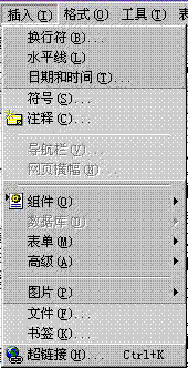 "插入"這個選單具有比較鮮明的frontpage特色,是專門為網頁編輯而服務的,它包括了十分豐富的內容,是網頁編輯中最常使用的動作。