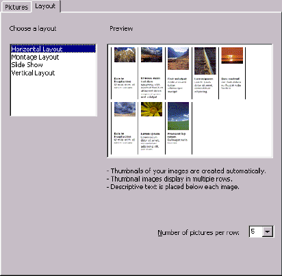在左邊樣式列表中提供了4個選項,分別選中在右邊窗口內會讓你預覽各自的顯示效果,其中首尾兩種都允許你設定每行放置圖片的個數.不論是使用哪種格式,前面在"pictures"標簽里設定的信息將全部有效.