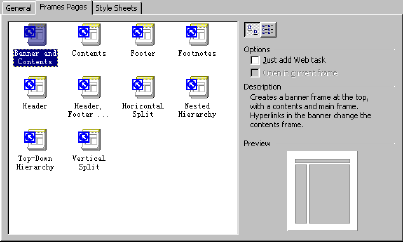 單擊"task pane"面板上的"page templates"選項,進入"網頁模板"窗口,選中"frames pages"標簽,如圖