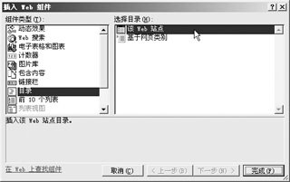 首先打開剛才創建的網頁new.htm,切換到網頁視圖,將插入點放在要創建目錄的位置,然后執行“插入/web組件”命令,在打開的對話框中,選擇“目錄”(如圖3),并在右邊的窗格中,選擇“該web站點”后單擊“完成”按鈕。