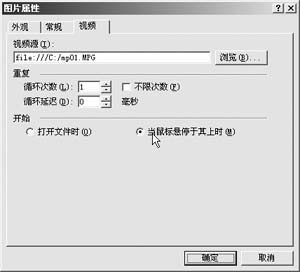 使用插入法添加視頻文件,可以在要插入視頻的地方單擊鼠標(biāo)右鍵,然后選擇“插入/圖片/視頻”命令,在打開(kāi)的“視頻”對(duì)話(huà)框中選擇文件后,“確定”即可,與前一種方法不同的是,插入法不會(huì)提供視頻播放的控制按鈕,因此瀏覽者無(wú)法控制視頻文件的播放。此時(shí)雙擊剛才插入的視頻播放圖標(biāo),可以打開(kāi)“圖片屬性”對(duì)話(huà)框,如圖4所示。在“視頻”選項(xiàng)卡中,單擊“瀏覽”按鈕可以改變視頻源文件,在“重復(fù)次數(shù)”和“循環(huán)延遲”中可以分別設(shè)置播放的次數(shù)和每次播放的間隔時(shí)間。在“開(kāi)始”中選擇“打開(kāi)文件”單選框,表示視頻將在打開(kāi)網(wǎng)頁(yè)時(shí)播放,選擇“當(dāng)鼠標(biāo)懸停其上時(shí)”表示當(dāng)鼠標(biāo)在視頻位置上經(jīng)過(guò)時(shí)開(kāi)始播放視頻文件。