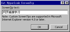 其中鏈接窗口"text to delay"里即我們前面選中的文本對(duì)象.注意一下在與此平行的位置還有一個(gè)"screentip"的按鈕.它所實(shí)現(xiàn)的功能等同于在源代碼里為鏈接添加了"title"屬性,即鼠標(biāo)停留在上面時(shí)的提示文本信息.單擊如圖