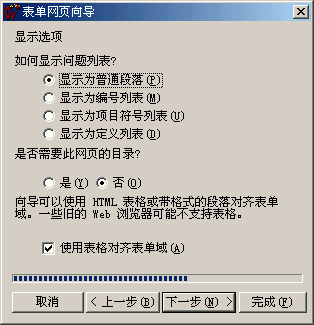 在"如何顯示問(wèn)題列表"下有4個(gè)單選鈕,是用來(lái)調(diào)整問(wèn)題的顯示方式,我們?cè)谶@里采用 "顯示為普通段落"的顯示方式,然后對(duì)選項(xiàng)不做改動(dòng),單擊"下一步"按鈕。如圖002。