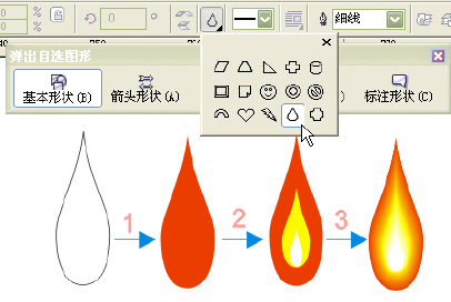 ||| 火焰――從預(yù)設(shè)工具欄中單擊基本形狀按鈕,從屬性欄的自選圖形中選擇火焰形狀的圖案,繪制外焰,按住shift向內(nèi)拖動控制手柄將其縮小,按右鍵復(fù)制一個作為內(nèi)焰,同樣方法制作焰心,再用交互式調(diào)和工具,簡單的幾步就可作出一般的火焰效果。具體過程參見圖8。