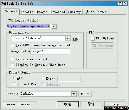 html layout method(html配置方式)列選欄:可以針對(duì)不同的對(duì)象選擇網(wǎng)頁(yè)的配置方案為html table(適用多數(shù)兼容)、layers(適用netscape4瀏覽器)、styles(適用netscape4/ms ie4或ms ie5瀏覽器)或single image with image map(用熱點(diǎn)的單一圖片)。